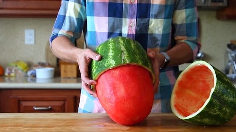 You might find yourself wondering, “How on earth is it possible to skin a watermelon like that?”. It’s a trick, of course! Perfect for impressing your friends and family with this easy party trick – All you’ll need is two similarly sized watermelons. Simply cut one in half, scooping out the watermelon into a bowl (which of course you’ll want to keep hidden in the fridge separately as to not blow your cover). Then carefully trim the other one of all its rines while maintaining its whole shape. Now, all you have to do is present the two together and you’ll have everyone fooled, for a moment anyway…