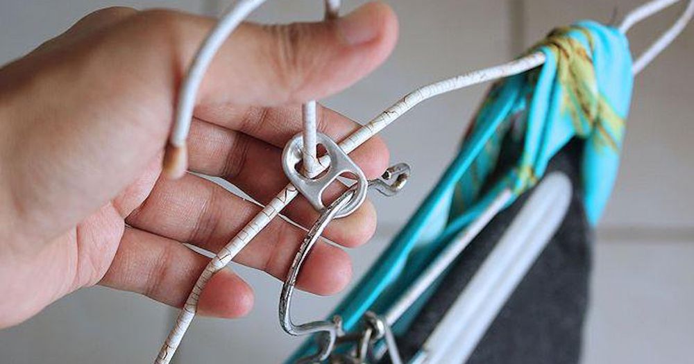 Running low on closet space? Simply pop the tab off of a soft-drink can and slip it over the hook of a hanger. Next, slip another hanger onto the bottom half of the tab, doubling the hanger space while not taking up any more closet space.
